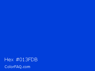 Hex #013fdb Color is a normal blue color and the nearest color is Absolute Zero #0048ba. Hex code #013fdb and RGB value is rgb(1,63,219). In RGB color space, this color is composed of 0% red, 25% green, 86% blue, In CMYK color space, this color is composed of 100% cyan, 71% magenta, 0% yellow , 14% black , In HSL color space, this color has a hue angle of 223° , 99% saturation and 43% lightness.