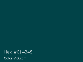 Hex #014348 Color is a very dark cyan color and the nearest color is Warm Black #004242. Hex code #014348 and RGB value is rgb(1,67,72). In RGB color space, this color is composed of 0% red, 26% green, 28% blue, In CMYK color space, this color is composed of 99% cyan, 7% magenta, 0% yellow , 72% black , In HSL color space, this color has a hue angle of 184° , 97% saturation and 14% lightness.