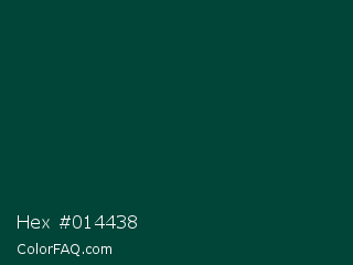 Hex #014438 Color is a very dark cyan color and the nearest color is Rich Black #004040. Hex code #014438 and RGB value is rgb(1,68,56). In RGB color space, this color is composed of 0% red, 27% green, 22% blue, In CMYK color space, this color is composed of 99% cyan, 0% magenta, 18% yellow , 73% black , In HSL color space, this color has a hue angle of 169° , 97% saturation and 14% lightness.