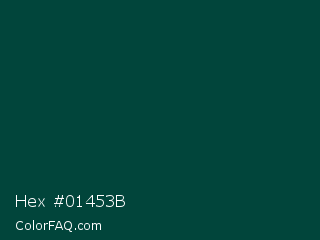 Hex #01453b Color is a very dark cyan color and the nearest color is Rich Black #004040. Hex code #01453b and RGB value is rgb(1,69,59). In RGB color space, this color is composed of 0% red, 27% green, 23% blue, In CMYK color space, this color is composed of 99% cyan, 0% magenta, 14% yellow , 73% black , In HSL color space, this color has a hue angle of 171° , 97% saturation and 14% lightness.