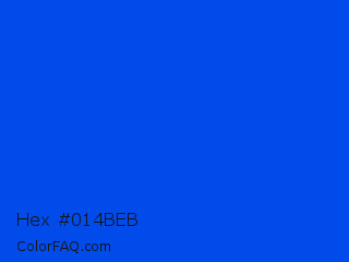 Hex #014beb Color is a normal blue color and the nearest color is Blue RYB #0247fe. Hex code #014beb and RGB value is rgb(1,75,235). In RGB color space, this color is composed of 0% red, 29% green, 92% blue, In CMYK color space, this color is composed of 100% cyan, 68% magenta, 0% yellow , 8% black , In HSL color space, this color has a hue angle of 221° , 99% saturation and 46% lightness.