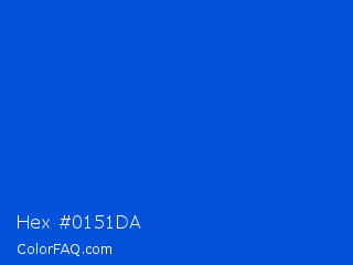Hex #0151da Color is a normal blue color and the nearest color is Science Blue #0066cc. Hex code #0151da and RGB value is rgb(1,81,218). In RGB color space, this color is composed of 0% red, 32% green, 85% blue, In CMYK color space, this color is composed of 100% cyan, 63% magenta, 0% yellow , 15% black , In HSL color space, this color has a hue angle of 218° , 99% saturation and 43% lightness.