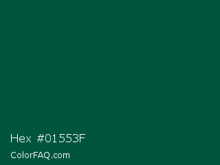 Hex #01553f Color is a very dark cyan color and the nearest color is Sacramento State Green #00563f. Hex code #01553f and RGB value is rgb(1,85,63). In RGB color space, this color is composed of 0% red, 33% green, 25% blue, In CMYK color space, this color is composed of 99% cyan, 0% magenta, 26% yellow , 67% black , In HSL color space, this color has a hue angle of 164° , 98% saturation and 17% lightness.