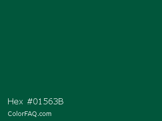Hex #01563b Color is a very dark green color and the nearest color is Sacramento State Green #00563f. Hex code #01563b and RGB value is rgb(1,86,59). In RGB color space, this color is composed of 0% red, 34% green, 23% blue, In CMYK color space, this color is composed of 99% cyan, 0% magenta, 31% yellow , 66% black , In HSL color space, this color has a hue angle of 161° , 98% saturation and 17% lightness.