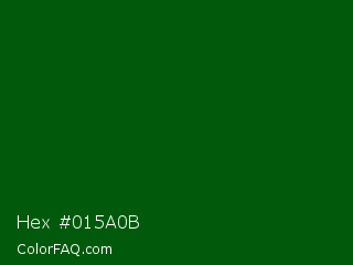 Hex #015a0b Color is a very dark green color and the nearest color is Deep Green #056608. Hex code #015a0b and RGB value is rgb(1,90,11). In RGB color space, this color is composed of 0% red, 35% green, 4% blue, In CMYK color space, this color is composed of 99% cyan, 0% magenta, 88% yellow , 65% black , In HSL color space, this color has a hue angle of 127° , 98% saturation and 18% lightness.