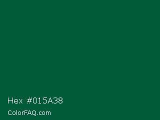 Hex #015a38 Color is a very dark green color and the nearest color is Sacramento State Green #00563f. Hex code #015a38 and RGB value is rgb(1,90,56). In RGB color space, this color is composed of 0% red, 35% green, 22% blue, In CMYK color space, this color is composed of 99% cyan, 0% magenta, 38% yellow , 65% black , In HSL color space, this color has a hue angle of 157° , 98% saturation and 18% lightness.