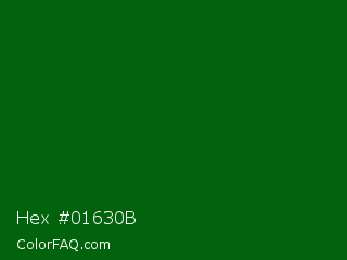 Hex #01630b Color is a very dark green color and the nearest color is Deep Green #056608. Hex code #01630b and RGB value is rgb(1,99,11). In RGB color space, this color is composed of 0% red, 39% green, 4% blue, In CMYK color space, this color is composed of 99% cyan, 0% magenta, 89% yellow , 61% black , In HSL color space, this color has a hue angle of 126° , 98% saturation and 20% lightness.
