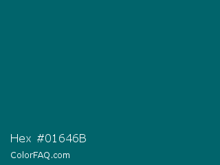 Hex #01646b Color is a very dark cyan color and the nearest color is Mosque #036a6e. Hex code #01646b and RGB value is rgb(1,100,107). In RGB color space, this color is composed of 0% red, 39% green, 42% blue, In CMYK color space, this color is composed of 99% cyan, 7% magenta, 0% yellow , 58% black , In HSL color space, this color has a hue angle of 184° , 98% saturation and 21% lightness.