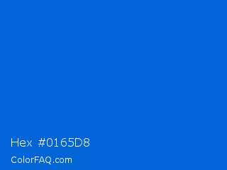 Hex #0165d8 Color is a normal blue color and the nearest color is Science Blue #0066cc. Hex code #0165d8 and RGB value is rgb(1,101,216). In RGB color space, this color is composed of 0% red, 40% green, 85% blue, In CMYK color space, this color is composed of 100% cyan, 53% magenta, 0% yellow , 15% black , In HSL color space, this color has a hue angle of 212° , 99% saturation and 43% lightness.