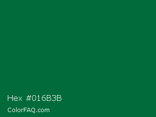 Hex #016b3b Color is a very dark green color and the nearest color is Cadmium Green #006b3c. Hex code #016b3b and RGB value is rgb(1,107,59). In RGB color space, this color is composed of 0% red, 42% green, 23% blue, In CMYK color space, this color is composed of 99% cyan, 0% magenta, 45% yellow , 58% black , In HSL color space, this color has a hue angle of 153° , 98% saturation and 21% lightness.