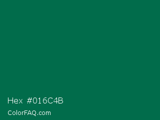 Hex #016c4b Color is a very dark green color and the nearest color is Bottle Green #006a4e. Hex code #016c4b and RGB value is rgb(1,108,75). In RGB color space, this color is composed of 0% red, 42% green, 29% blue, In CMYK color space, this color is composed of 99% cyan, 0% magenta, 31% yellow , 58% black , In HSL color space, this color has a hue angle of 161° , 98% saturation and 21% lightness.