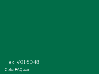 Hex #016d48 Color is a very dark green color and the nearest color is Bottle Green #006a4e. Hex code #016d48 and RGB value is rgb(1,109,72). In RGB color space, this color is composed of 0% red, 43% green, 28% blue, In CMYK color space, this color is composed of 99% cyan, 0% magenta, 34% yellow , 57% black , In HSL color space, this color has a hue angle of 159° , 98% saturation and 22% lightness.