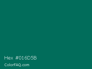 Hex #016d5b Color is a very dark cyan color and the nearest color is Watercourse #056f57. Hex code #016d5b and RGB value is rgb(1,109,91). In RGB color space, this color is composed of 0% red, 43% green, 36% blue, In CMYK color space, this color is composed of 99% cyan, 0% magenta, 17% yellow , 57% black , In HSL color space, this color has a hue angle of 170° , 98% saturation and 22% lightness.