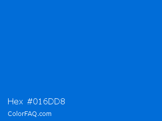 Hex #016dd8 Color is a normal blue color and the nearest color is True Blue #0073cf. Hex code #016dd8 and RGB value is rgb(1,109,216). In RGB color space, this color is composed of 0% red, 43% green, 85% blue, In CMYK color space, this color is composed of 100% cyan, 50% magenta, 0% yellow , 15% black , In HSL color space, this color has a hue angle of 210° , 99% saturation and 43% lightness.