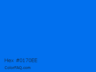 Hex #0170ee Color is a normal blue color and the nearest color is Brandeis Blue #0070ff. Hex code #0170ee and RGB value is rgb(1,112,238). In RGB color space, this color is composed of 0% red, 44% green, 93% blue, In CMYK color space, this color is composed of 100% cyan, 53% magenta, 0% yellow , 7% black , In HSL color space, this color has a hue angle of 212° , 99% saturation and 47% lightness.