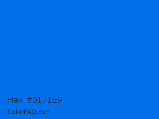 Hex #0171e9 Color is a normal blue color and the nearest color is Brandeis Blue #0070ff. Hex code #0171e9 and RGB value is rgb(1,113,233). In RGB color space, this color is composed of 0% red, 44% green, 91% blue, In CMYK color space, this color is composed of 100% cyan, 52% magenta, 0% yellow , 9% black , In HSL color space, this color has a hue angle of 211° , 99% saturation and 46% lightness.