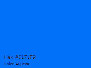 Hex #0171f9 Color is a normal blue color and the nearest color is Brandeis Blue #0070ff. Hex code #0171f9 and RGB value is rgb(1,113,249). In RGB color space, this color is composed of 0% red, 44% green, 98% blue, In CMYK color space, this color is composed of 100% cyan, 55% magenta, 0% yellow , 2% black , In HSL color space, this color has a hue angle of 213° , 99% saturation and 49% lightness.