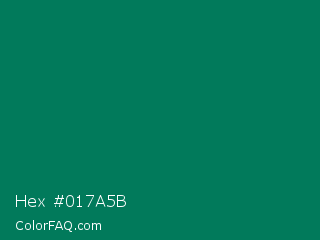 Hex #017a5b Color is a dark cyan color and the nearest color is Spanish Viridian #007f5c. Hex code #017a5b and RGB value is rgb(1,122,91). In RGB color space, this color is composed of 0% red, 48% green, 36% blue, In CMYK color space, this color is composed of 99% cyan, 0% magenta, 25% yellow , 52% black , In HSL color space, this color has a hue angle of 165° , 98% saturation and 24% lightness.