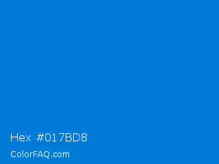 Hex #017bd8 Color is a normal blue color and the nearest color is True Blue #0073cf. Hex code #017bd8 and RGB value is rgb(1,123,216). In RGB color space, this color is composed of 0% red, 48% green, 85% blue, In CMYK color space, this color is composed of 100% cyan, 43% magenta, 0% yellow , 15% black , In HSL color space, this color has a hue angle of 206° , 99% saturation and 43% lightness.