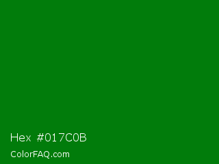 Hex #017c0b Color is a dark green color and the nearest color is Office Green #008000. Hex code #017c0b and RGB value is rgb(1,124,11). In RGB color space, this color is composed of 0% red, 49% green, 4% blue, In CMYK color space, this color is composed of 99% cyan, 0% magenta, 91% yellow , 51% black , In HSL color space, this color has a hue angle of 125° , 98% saturation and 25% lightness.