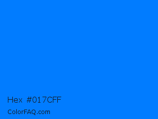 Hex #017cff Color is a normal blue color and the nearest color is Azure Radiance #007fff. Hex code #017cff and RGB value is rgb(1,124,255). In RGB color space, this color is composed of 0% red, 49% green, 100% blue, In CMYK color space, this color is composed of 100% cyan, 51% magenta, 0% yellow , 0% black , In HSL color space, this color has a hue angle of 211° , 100% saturation and 50% lightness.