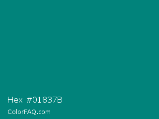 Hex #01837b Color is a dark cyan color and the nearest color is Teal Green #00827f. Hex code #01837b and RGB value is rgb(1,131,123). In RGB color space, this color is composed of 0% red, 51% green, 48% blue, In CMYK color space, this color is composed of 99% cyan, 0% magenta, 6% yellow , 49% black , In HSL color space, this color has a hue angle of 176° , 98% saturation and 26% lightness.