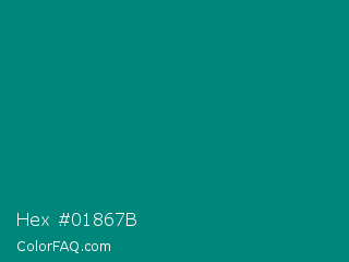 Hex #01867b Color is a dark cyan color and the nearest color is Teal Green #00827f. Hex code #01867b and RGB value is rgb(1,134,123). In RGB color space, this color is composed of 0% red, 53% green, 48% blue, In CMYK color space, this color is composed of 99% cyan, 0% magenta, 8% yellow , 47% black , In HSL color space, this color has a hue angle of 175° , 99% saturation and 26% lightness.