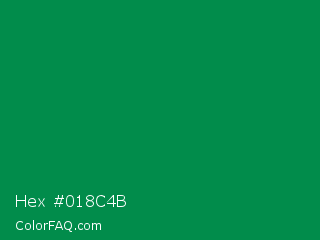 Hex #018c4b Color is a dark green color and the nearest color is Spanish Green #009150. Hex code #018c4b and RGB value is rgb(1,140,75). In RGB color space, this color is composed of 0% red, 55% green, 29% blue, In CMYK color space, this color is composed of 99% cyan, 0% magenta, 46% yellow , 45% black , In HSL color space, this color has a hue angle of 152° , 99% saturation and 28% lightness.