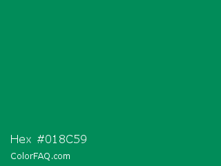 Hex #018c59 Color is a dark green color and the nearest color is Spanish Green #009150. Hex code #018c59 and RGB value is rgb(1,140,89). In RGB color space, this color is composed of 0% red, 55% green, 35% blue, In CMYK color space, this color is composed of 99% cyan, 0% magenta, 36% yellow , 45% black , In HSL color space, this color has a hue angle of 158° , 99% saturation and 28% lightness.