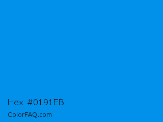 Hex #0191eb Color is a normal blue color and the nearest color is Vivid Cerulean #00aaee. Hex code #0191eb and RGB value is rgb(1,145,235). In RGB color space, this color is composed of 0% red, 57% green, 92% blue, In CMYK color space, this color is composed of 100% cyan, 38% magenta, 0% yellow , 8% black , In HSL color space, this color has a hue angle of 203° , 99% saturation and 46% lightness.