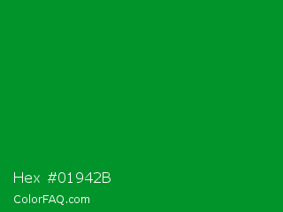 Hex #01942b Color is a dark green color and the nearest color is North Texas Green #059033. Hex code #01942b and RGB value is rgb(1,148,43). In RGB color space, this color is composed of 0% red, 58% green, 17% blue, In CMYK color space, this color is composed of 99% cyan, 0% magenta, 71% yellow , 42% black , In HSL color space, this color has a hue angle of 137° , 99% saturation and 29% lightness.