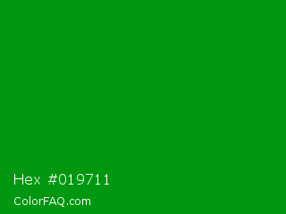 Hex #019711 Color is a dark green color and the nearest color is Islamic Green #009000. Hex code #019711 and RGB value is rgb(1,151,17). In RGB color space, this color is composed of 0% red, 59% green, 7% blue, In CMYK color space, this color is composed of 99% cyan, 0% magenta, 89% yellow , 41% black , In HSL color space, this color has a hue angle of 126° , 99% saturation and 30% lightness.