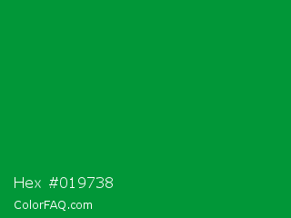 Hex #019738 Color is a dark green color and the nearest color is North Texas Green #059033. Hex code #019738 and RGB value is rgb(1,151,56). In RGB color space, this color is composed of 0% red, 59% green, 22% blue, In CMYK color space, this color is composed of 99% cyan, 0% magenta, 63% yellow , 41% black , In HSL color space, this color has a hue angle of 142° , 99% saturation and 30% lightness.