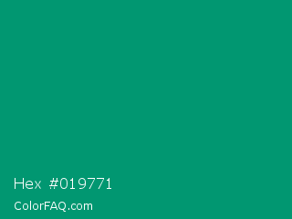 Hex #019771 Color is a dark cyan color and the nearest color is Green NCS #009f6b. Hex code #019771 and RGB value is rgb(1,151,113). In RGB color space, this color is composed of 0% red, 59% green, 44% blue, In CMYK color space, this color is composed of 99% cyan, 0% magenta, 25% yellow , 41% black , In HSL color space, this color has a hue angle of 165° , 99% saturation and 30% lightness.