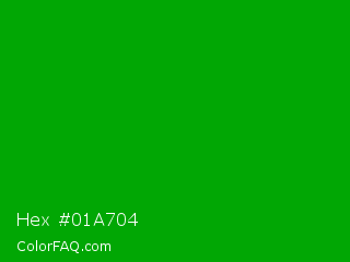 Hex #01a704 Color is a normal green color and the nearest color is Islamic Green #009000. Hex code #01a704 and RGB value is rgb(1,167,4). In RGB color space, this color is composed of 0% red, 65% green, 2% blue, In CMYK color space, this color is composed of 99% cyan, 0% magenta, 98% yellow , 35% black , In HSL color space, this color has a hue angle of 121° , 99% saturation and 33% lightness.