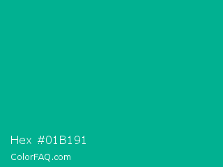 Hex #01b191 Color is a normal cyan color and the nearest color is Persian Green #00a693. Hex code #01b191 and RGB value is rgb(1,177,145). In RGB color space, this color is composed of 0% red, 69% green, 57% blue, In CMYK color space, this color is composed of 99% cyan, 0% magenta, 18% yellow , 31% black , In HSL color space, this color has a hue angle of 169° , 99% saturation and 35% lightness.