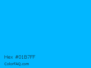 Hex #01b7ff Color is a normal blue color and the nearest color is Blue Bolt #00b9fb. Hex code #01b7ff and RGB value is rgb(1,183,255). In RGB color space, this color is composed of 0% red, 72% green, 100% blue, In CMYK color space, this color is composed of 100% cyan, 28% magenta, 0% yellow , 0% black , In HSL color space, this color has a hue angle of 197° , 100% saturation and 50% lightness.