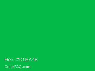 Hex #01ba48 Color is a normal green color and the nearest color is Dark Pastel Green #03c03c. Hex code #01ba48 and RGB value is rgb(1,186,72). In RGB color space, this color is composed of 0% red, 73% green, 28% blue, In CMYK color space, this color is composed of 99% cyan, 0% magenta, 61% yellow , 27% black , In HSL color space, this color has a hue angle of 143° , 99% saturation and 37% lightness.