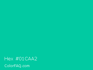 Hex #01caa2 Color is a normal cyan color and the nearest color is Caribbean Green #00cc99. Hex code #01caa2 and RGB value is rgb(1,202,162). In RGB color space, this color is composed of 0% red, 79% green, 64% blue, In CMYK color space, this color is composed of 100% cyan, 0% magenta, 20% yellow , 21% black , In HSL color space, this color has a hue angle of 168° , 99% saturation and 40% lightness.