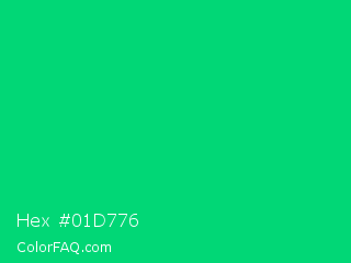 Hex #01d776 Color is a normal green color and the nearest color is Caribbean Green #00cc99. Hex code #01d776 and RGB value is rgb(1,215,118). In RGB color space, this color is composed of 0% red, 84% green, 46% blue, In CMYK color space, this color is composed of 100% cyan, 0% magenta, 45% yellow , 16% black , In HSL color space, this color has a hue angle of 153° , 99% saturation and 42% lightness.