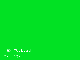 Hex #01e123 Color is a normal green color and the nearest color is Vivid Malachite #00cc33. Hex code #01e123 and RGB value is rgb(1,225,35). In RGB color space, this color is composed of 0% red, 88% green, 14% blue, In CMYK color space, this color is composed of 100% cyan, 0% magenta, 84% yellow , 12% black , In HSL color space, this color has a hue angle of 129° , 99% saturation and 44% lightness.