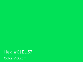 Hex #01e157 Color is a normal green color and the nearest color is Malachite #0bda51. Hex code #01e157 and RGB value is rgb(1,225,87). In RGB color space, this color is composed of 0% red, 88% green, 34% blue, In CMYK color space, this color is composed of 100% cyan, 0% magenta, 61% yellow , 12% black , In HSL color space, this color has a hue angle of 143° , 99% saturation and 44% lightness.