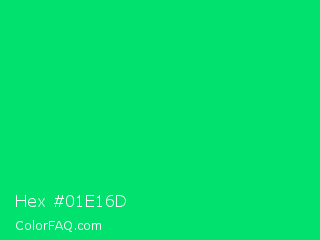 Hex #01e16d Color is a normal green color and the nearest color is Malachite #0bda51. Hex code #01e16d and RGB value is rgb(1,225,109). In RGB color space, this color is composed of 0% red, 88% green, 43% blue, In CMYK color space, this color is composed of 100% cyan, 0% magenta, 52% yellow , 12% black , In HSL color space, this color has a hue angle of 149° , 99% saturation and 44% lightness.