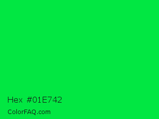 Hex #01e742 Color is a normal green color and the nearest color is Malachite #0bda51. Hex code #01e742 and RGB value is rgb(1,231,66). In RGB color space, this color is composed of 0% red, 91% green, 26% blue, In CMYK color space, this color is composed of 100% cyan, 0% magenta, 71% yellow , 9% black , In HSL color space, this color has a hue angle of 137° , 99% saturation and 45% lightness.