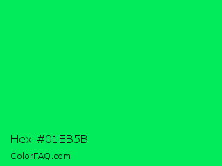 Hex #01eb5b Color is a normal green color and the nearest color is Malachite #0bda51. Hex code #01eb5b and RGB value is rgb(1,235,91). In RGB color space, this color is composed of 0% red, 92% green, 36% blue, In CMYK color space, this color is composed of 100% cyan, 0% magenta, 61% yellow , 8% black , In HSL color space, this color has a hue angle of 143° , 99% saturation and 46% lightness.