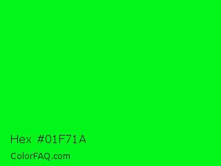 Hex #01f71a Color is a normal green color and the nearest color is Green #00ff00. Hex code #01f71a and RGB value is rgb(1,247,26). In RGB color space, this color is composed of 0% red, 97% green, 10% blue, In CMYK color space, this color is composed of 100% cyan, 0% magenta, 89% yellow , 3% black , In HSL color space, this color has a hue angle of 126° , 99% saturation and 49% lightness.