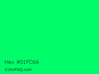 Hex #01fc6a Color is a normal green color and the nearest color is Spring Green #00ff7f. Hex code #01fc6a and RGB value is rgb(1,252,106). In RGB color space, this color is composed of 0% red, 99% green, 42% blue, In CMYK color space, this color is composed of 100% cyan, 0% magenta, 58% yellow , 1% black , In HSL color space, this color has a hue angle of 145° , 99% saturation and 50% lightness.