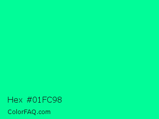 Hex #01fc98 Color is a normal green color and the nearest color is Medium Spring Green #00fa9a. Hex code #01fc98 and RGB value is rgb(1,252,152). In RGB color space, this color is composed of 0% red, 99% green, 60% blue, In CMYK color space, this color is composed of 100% cyan, 0% magenta, 40% yellow , 1% black , In HSL color space, this color has a hue angle of 156° , 99% saturation and 50% lightness.