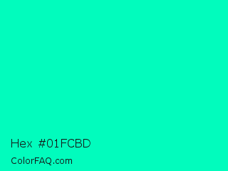 Hex #01fcbd Color is a normal cyan color and the nearest color is Medium Spring Green #00fa9a. Hex code #01fcbd and RGB value is rgb(1,252,189). In RGB color space, this color is composed of 0% red, 99% green, 74% blue, In CMYK color space, this color is composed of 100% cyan, 0% magenta, 25% yellow , 1% black , In HSL color space, this color has a hue angle of 165° , 99% saturation and 50% lightness.