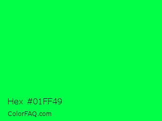 Hex #01ff49 Color is a normal green color and the nearest color is Malachite #0bda51. Hex code #01ff49 and RGB value is rgb(1,255,73). In RGB color space, this color is composed of 0% red, 100% green, 29% blue, In CMYK color space, this color is composed of 100% cyan, 0% magenta, 71% yellow , 0% black , In HSL color space, this color has a hue angle of 137° , 100% saturation and 50% lightness.